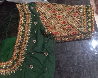 Pure Pattu Silk Green Maggam Blouse With Kundan Work All Over Etsy